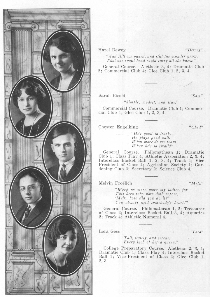 1923 Sheboygan High School, Page 20: Hazel Dewey, Sarah Eisold, Chester Engelking, Melvin Froelich, Lora Gess.