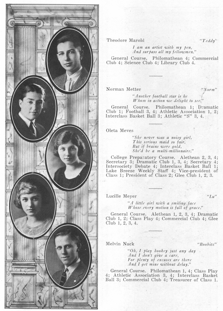 1923 Sheboygan High School, Page 23: Theodore Marold, Norman Metter, Oleta Meves, Lucille Meyer, Melvin Nack.