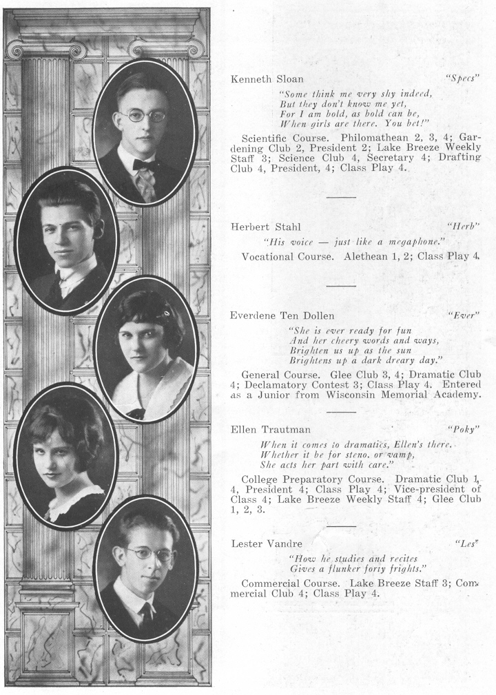 1923 Sheboygan High School, Page 25: Kenneth Sloan, Herbert Stahl, Everdene Ten Dollen, Ellen Trautman, Lester Vandre.