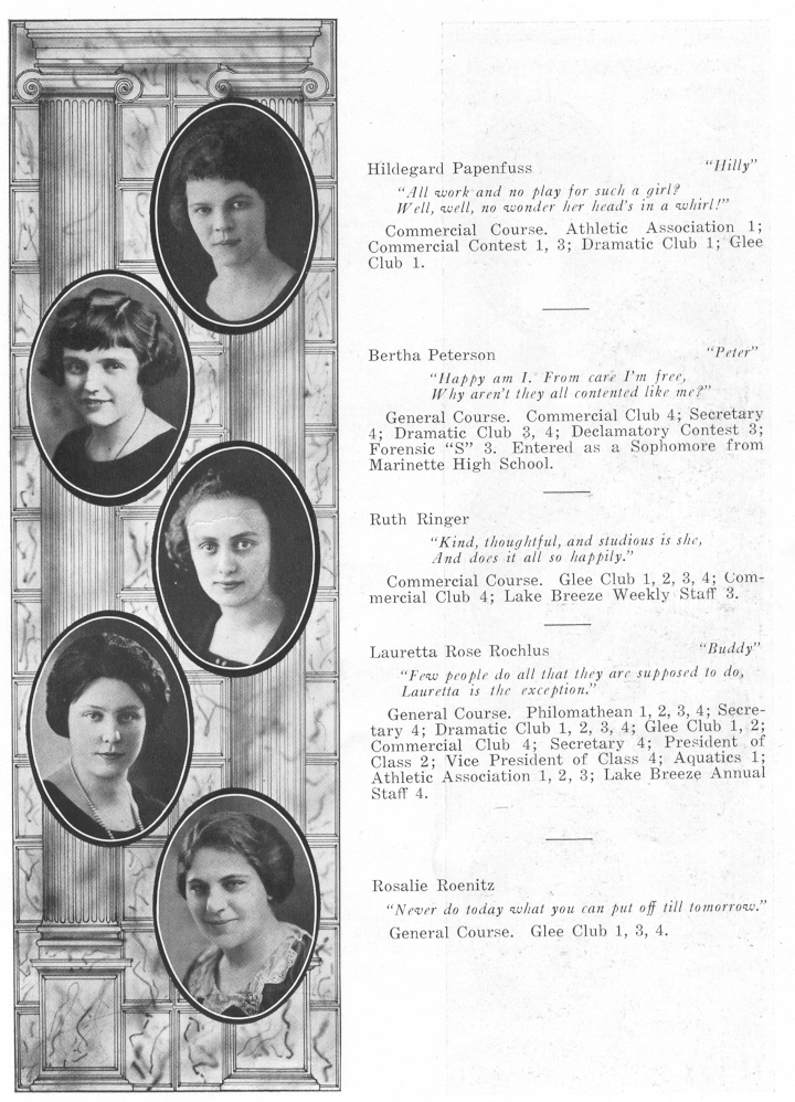 1923 Sheboygan High School, Page 43: Hildegard Papenfuss, Bertha Peterson, Ruth Ringer, Lauretta Rochlus, Rosalie Roenitz.