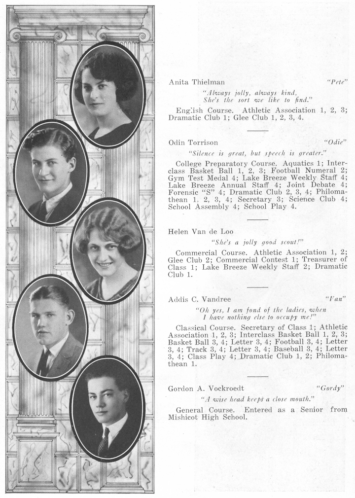 1923 Sheboygan High School, Page 46: Anita Thielman, Odin Torrison, Helen Van de Loo, Addis Vandree, Gordon Vockroedt.