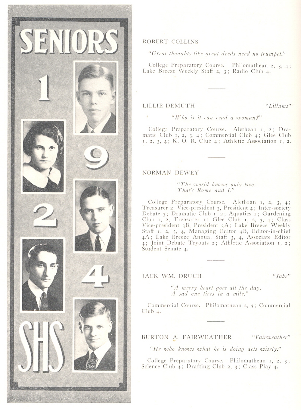 1924 Sheboygan High School, Page 20: Robert Collins, Lillie Demuth, Norman Dewey, Jack Druch, Burton Fairweather.