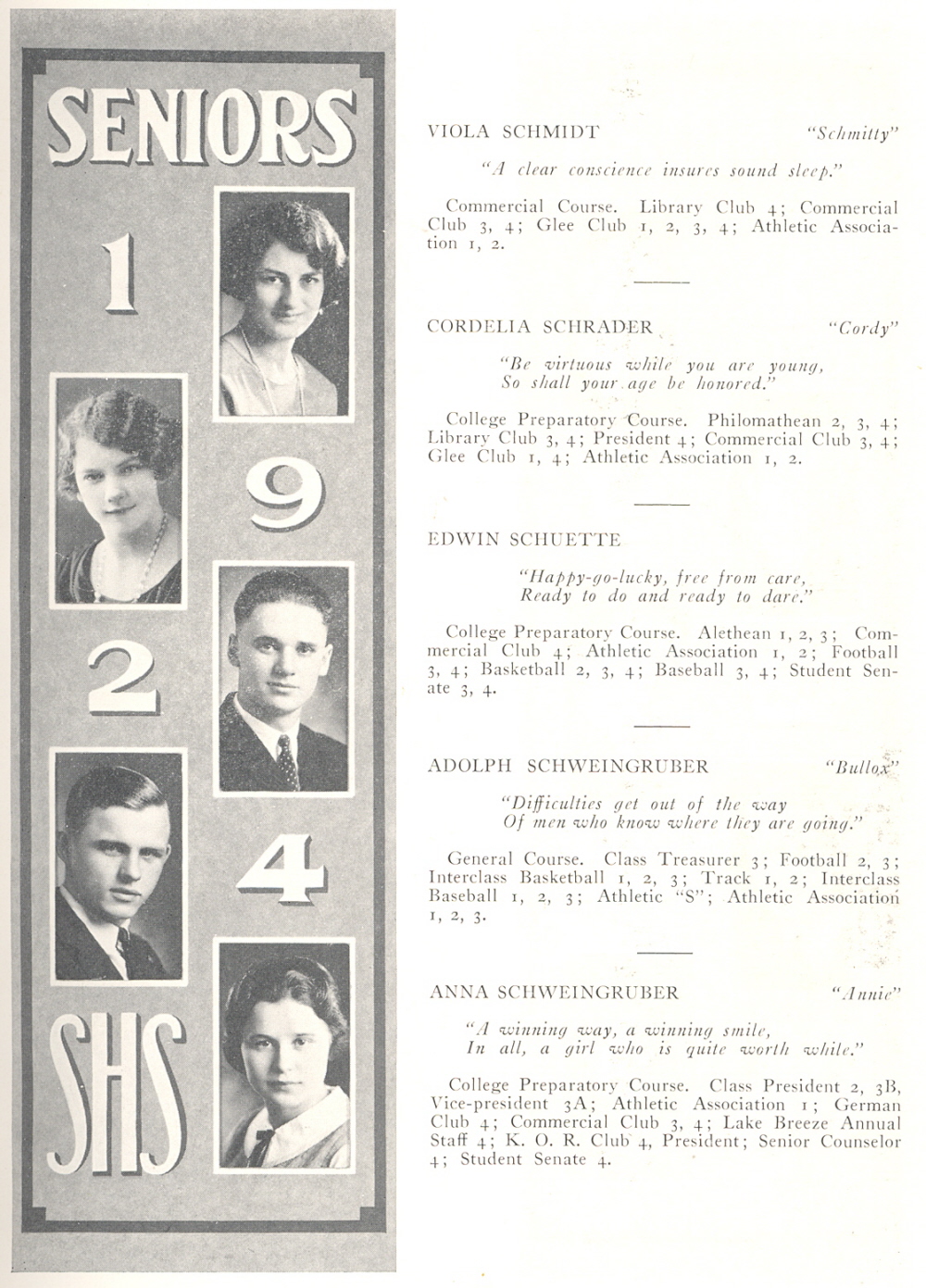 1924 Sheboygan High School, Page 27: Viola Schmidt, Cordelia Schrader, Edwin Schuette, Adolph Schweingruber, Anna Schweingruber.