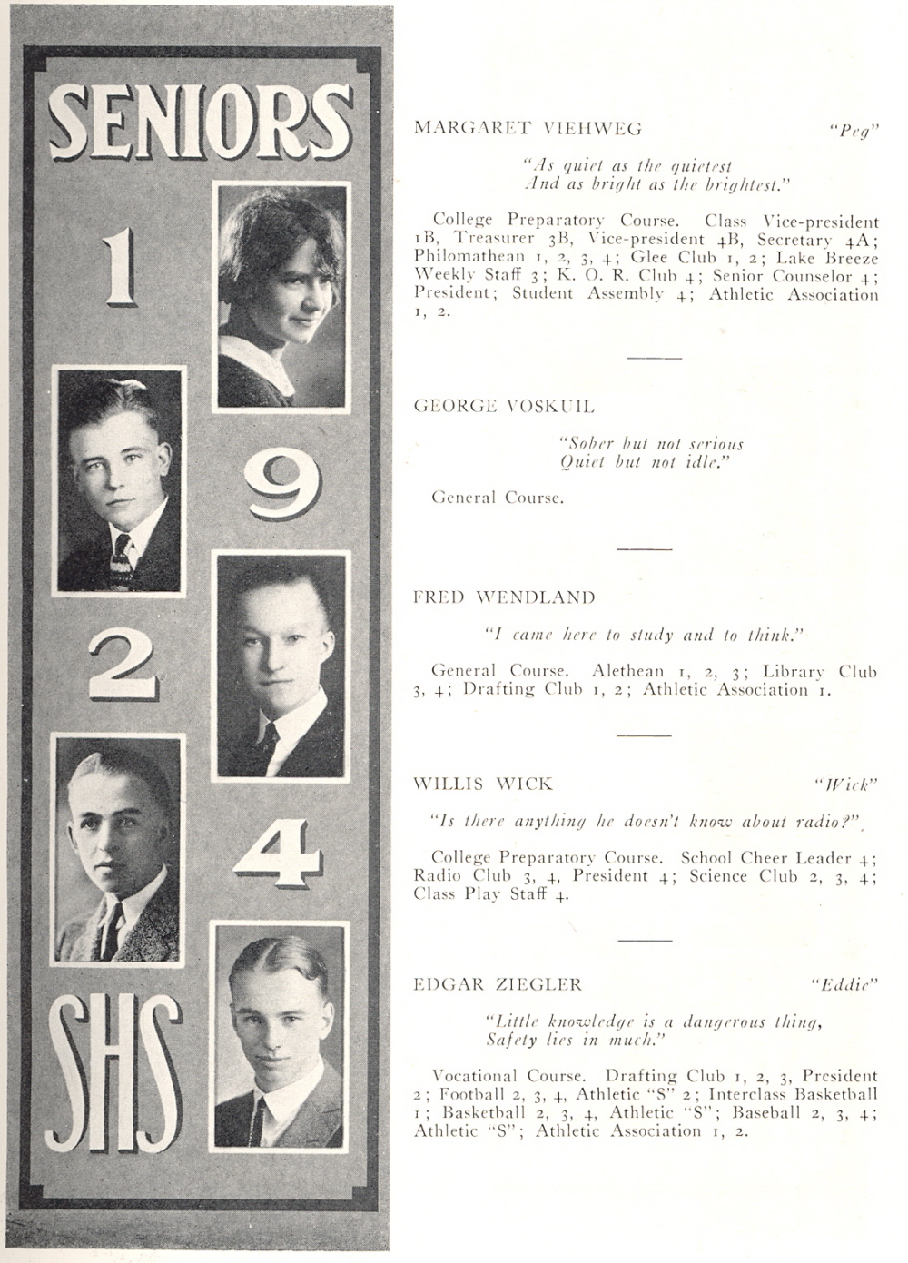 1924 Sheboygan High School, Page 29: Margaret Viehweg, George Voskuil, Fred Wendland, Willis Wick, Edgar Ziegler.