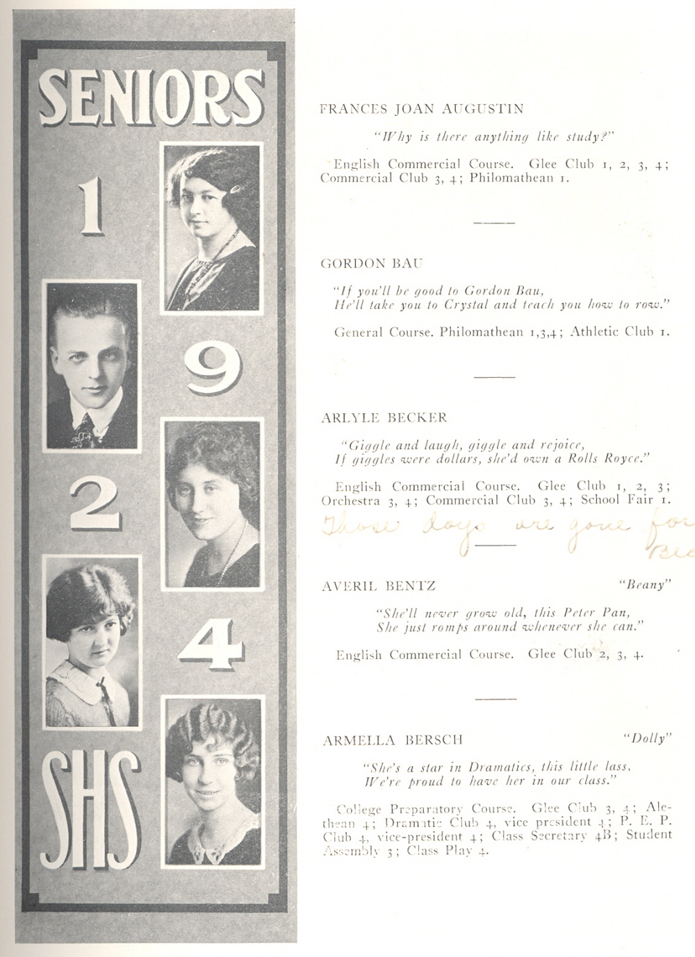 1924 Sheboygan High School, Page 45: Frances Augustin, Gordon Bau, Arlyle Becker, Averil Bentz, Armella Bersch.