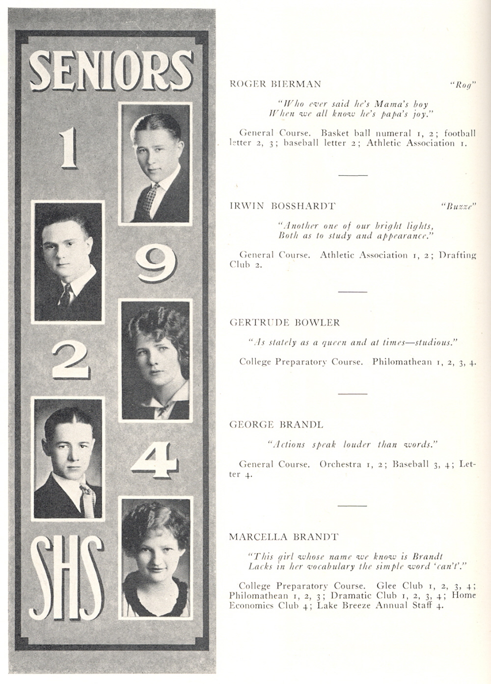 1924 Sheboygan High School, Page 46: Roger Bierman, Irwin Bosshardt, Gertrude Bowler, George Brandl, Marcella Brandt.