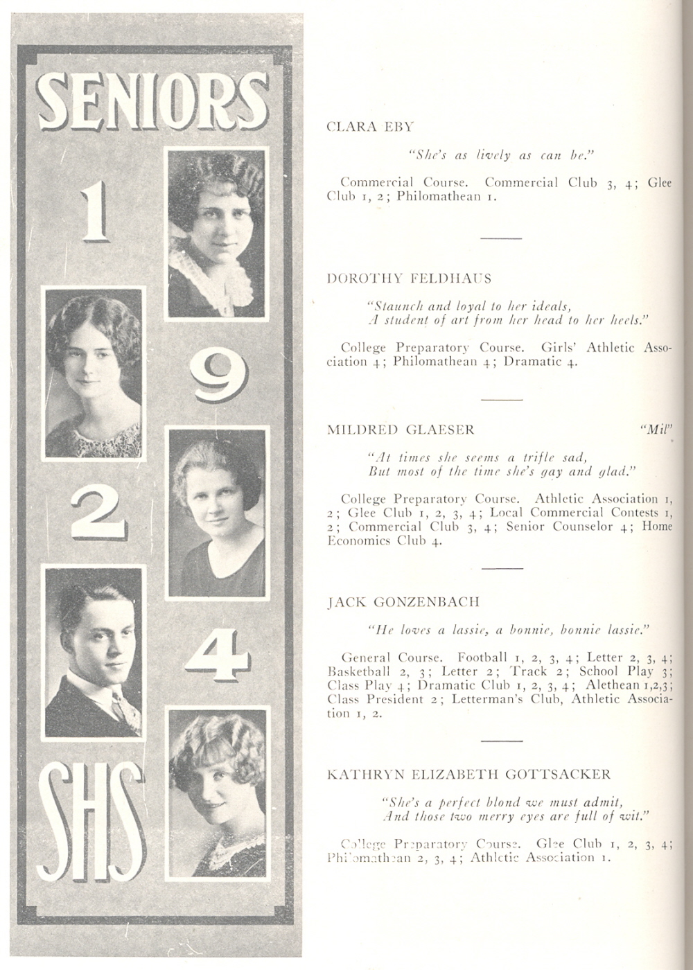 1924 Sheboygan High School, Page 48: Clara Eby, Dorothy Feldhaus, Mildred Glaeser, Jack Gonzenbach, Kathryn Gottsacker.
