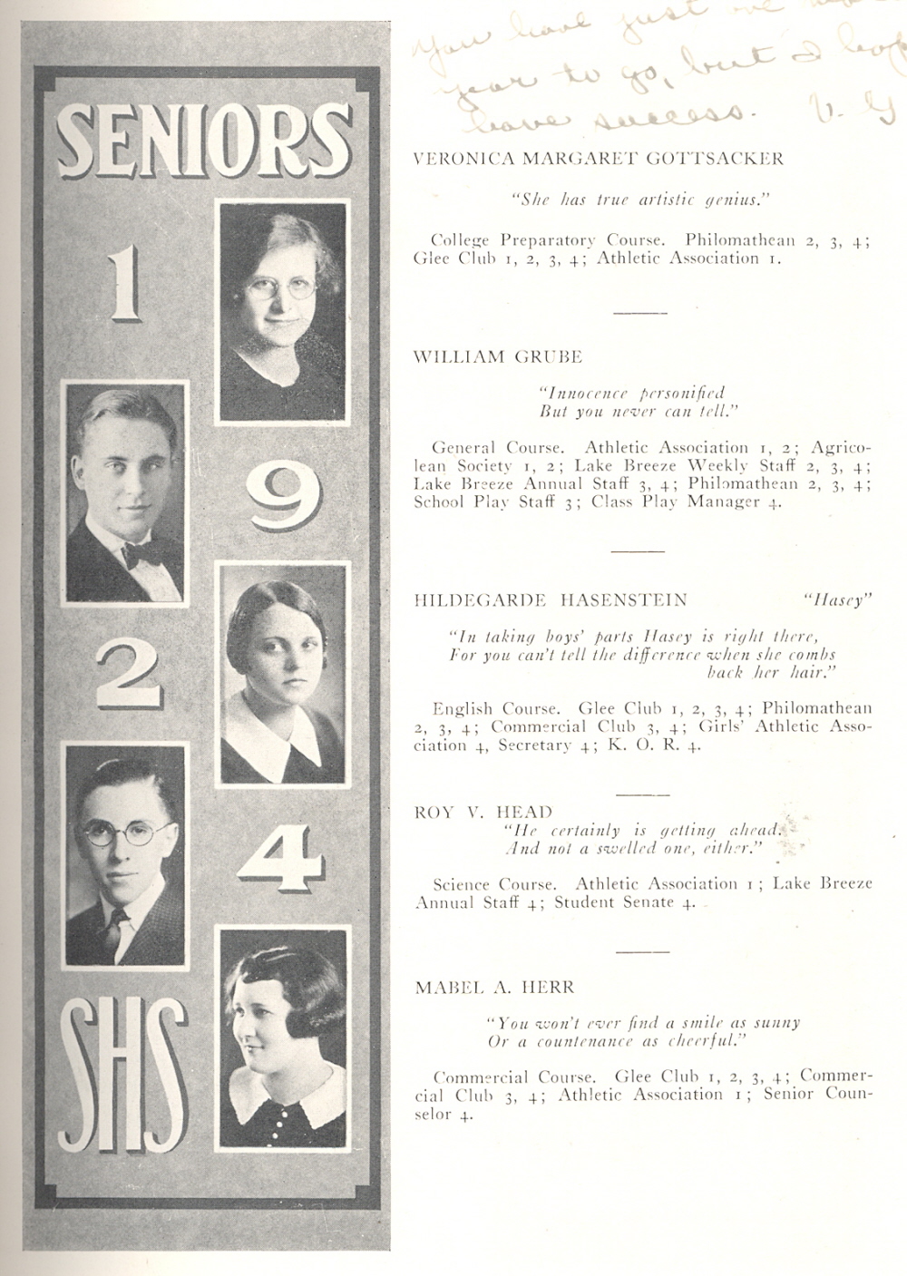 1924 Sheboygan High School, Page 49: Veronica Gottsacker, William Grube, Hildegarde Hasenstein, Roy Head, Mabel Herr.