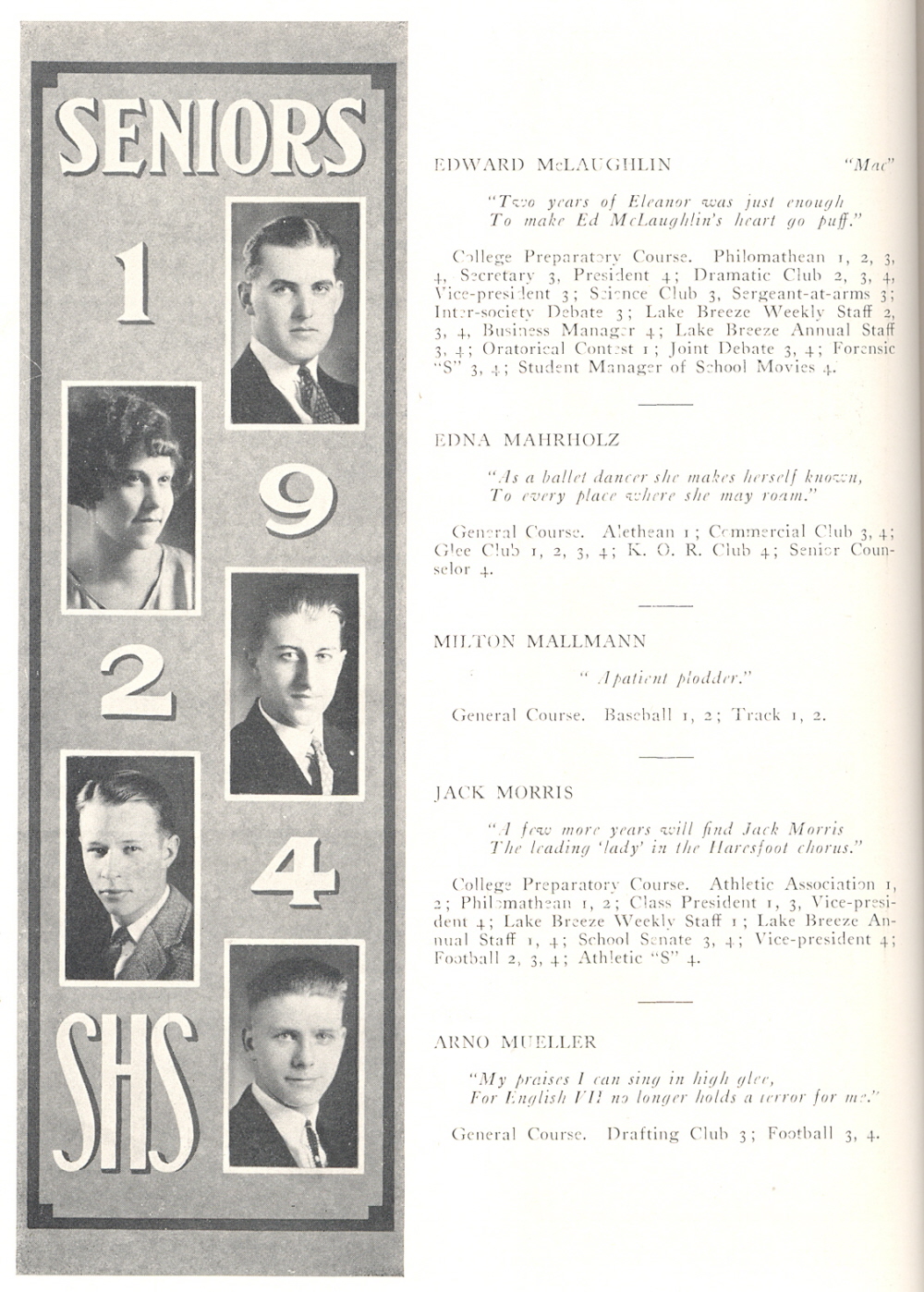 1924 Sheboygan High School, Page 52: Edward McLaughlin, Edna Mahrholz, Milton Mallmann, Jack Morris, Arno Mueller.