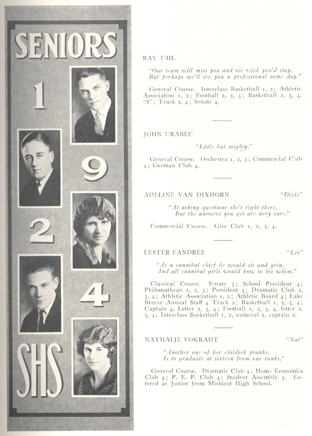 1924 Sheboygan High School, Page 57: Ray Uhl, John Urabec, Adeline Van Dixhorn, Lester Vandree, Nathalie Vokradt.
