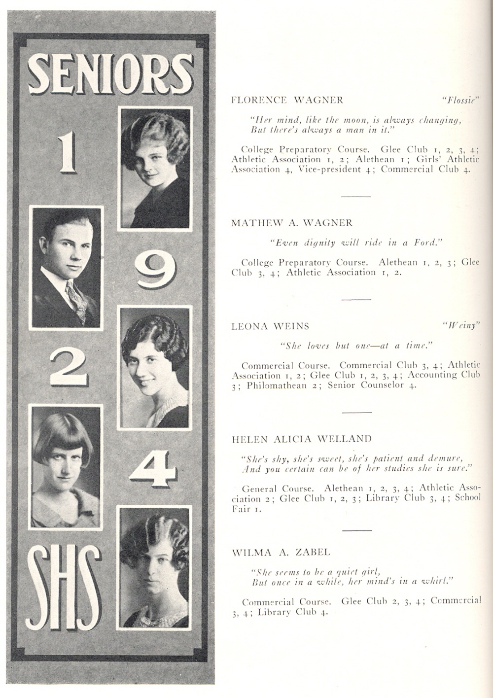 1924 Sheboygan High School, Page 58: Florence Wagner, Mathew Wagner, Leona Weins, Helen Welland, Wilma Zabel.