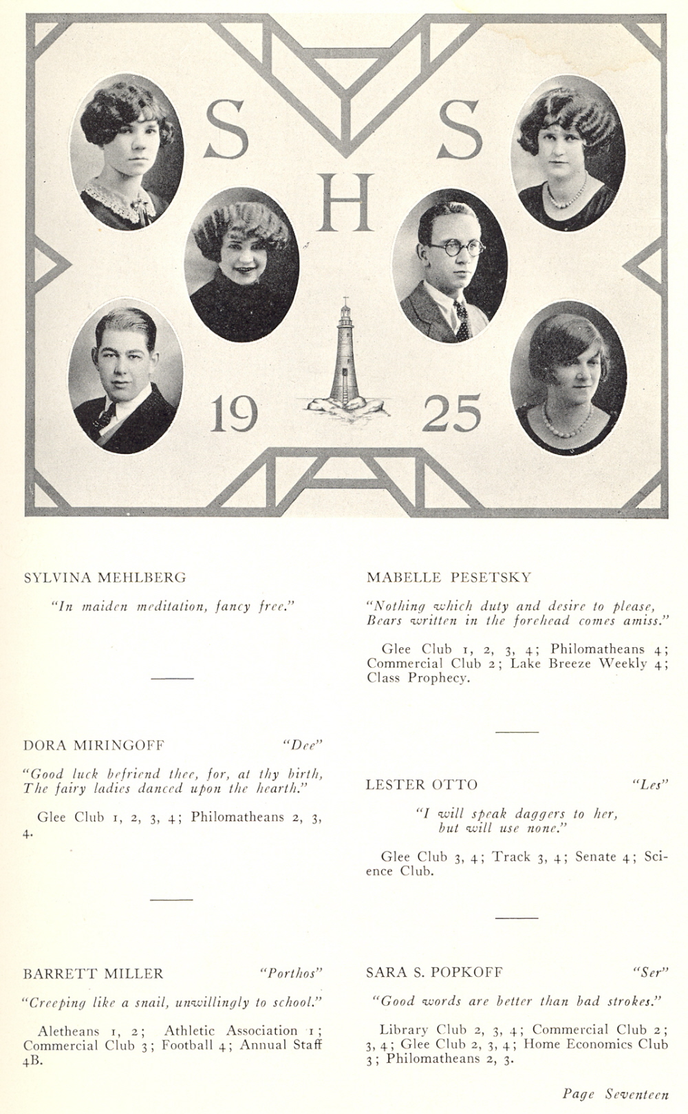 1925 Sheboygan High School, Page 17: Sylvina Mehlberg, Dora Miringoff, Barrett Miller, Mabelle Pesetsky, Lester Otto, Sara S. Popkoff.