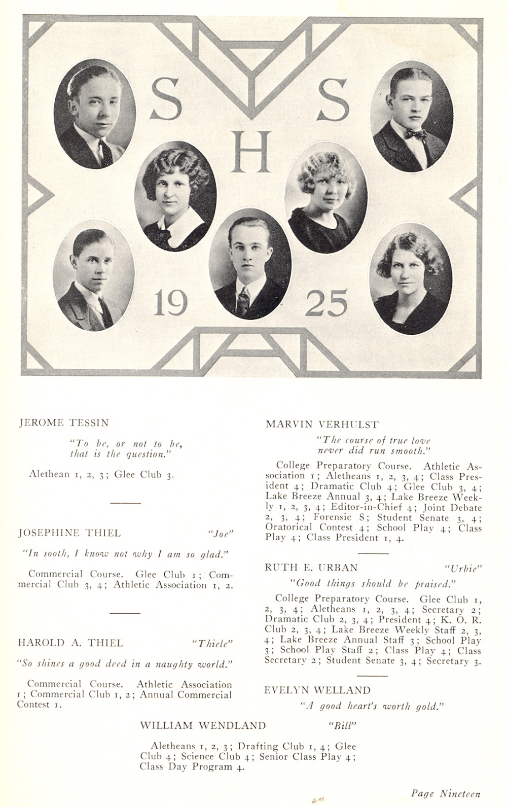 1925 Sheboygan High School, Page 19: Jerome Tessin, Josephine Thiel, Harold A. Thiel, Marvin Verhulst, Ruth E. Urban, Evelyn Welland, William Wendland.