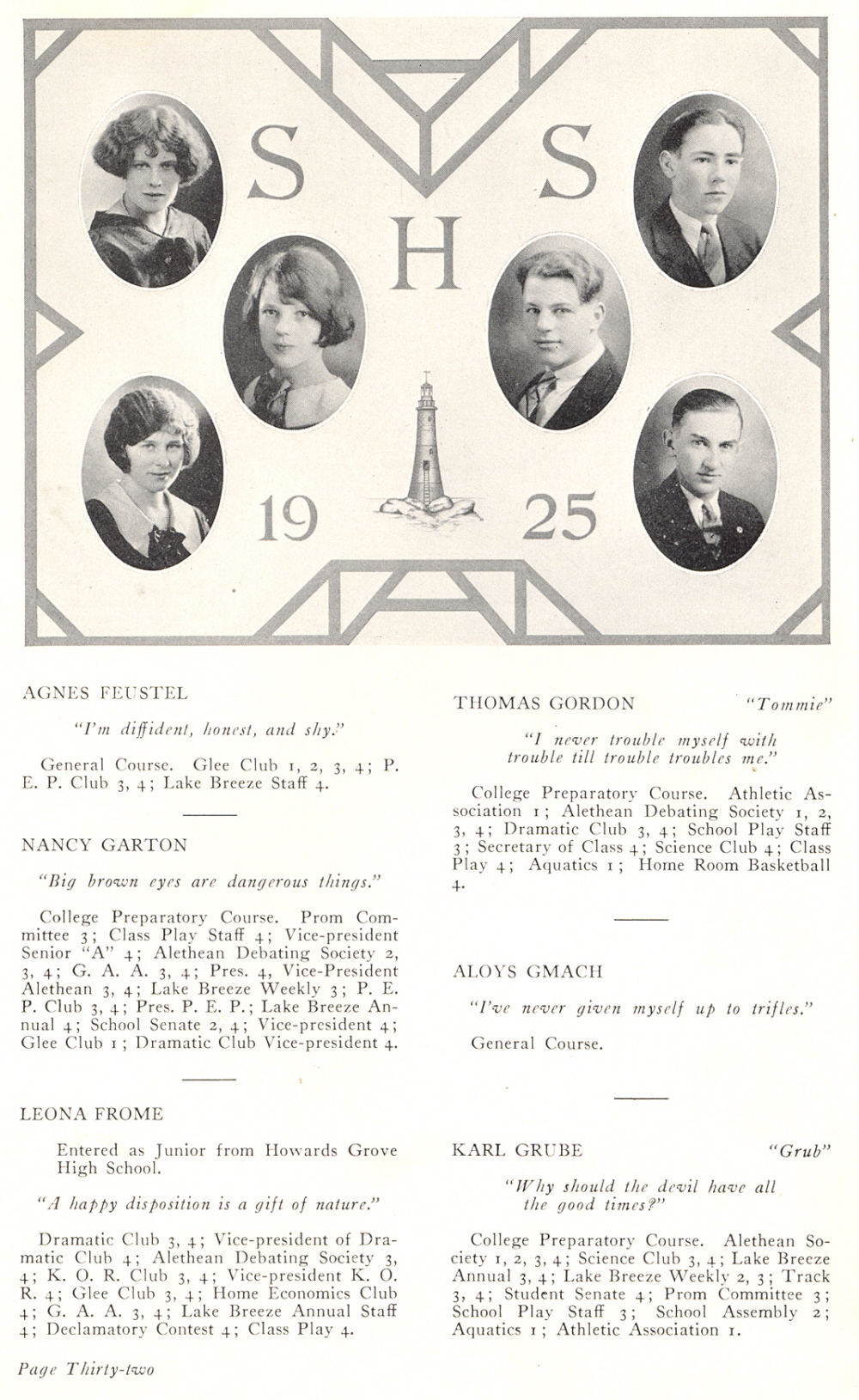 1925 Sheboygan High School, Page 32: Agnes Feustel, Nancy Garton, Leona Frome, Thomas Gordon, Aloys Gmach, Karl Grube.