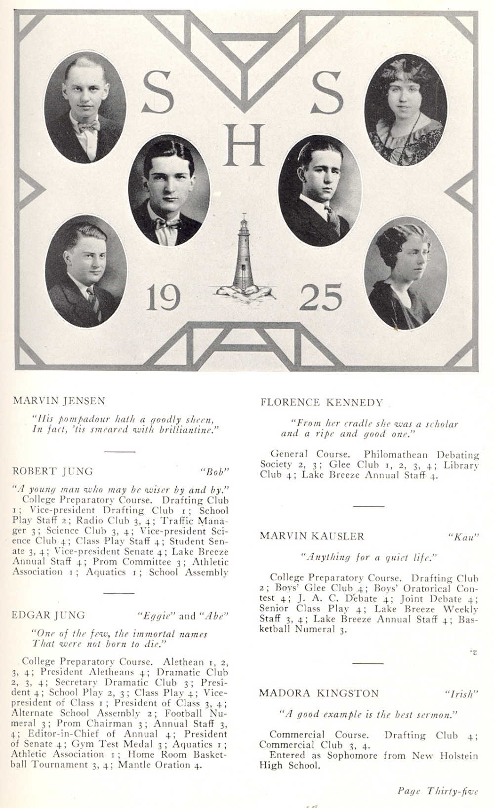 1925 Sheboygan High School, Page 35: Marvin Jensen, Robert Jung, Edgar Jung, Florence Kennedy, Marvin Kausler, Madora Kingston.