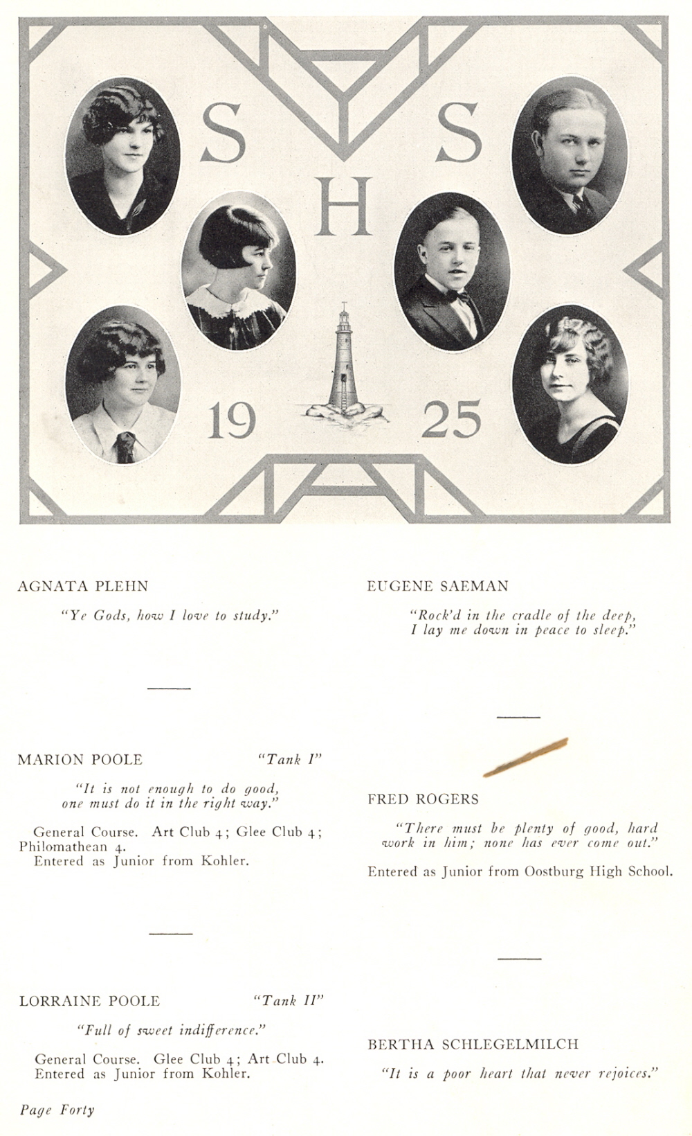1925 Sheboygan High School, Page 40: Agnata Plehn, Marion Poole, Lorraine Poole, Eugene Saeman, Fred Rogers, Bertha Schlegelmilch.
