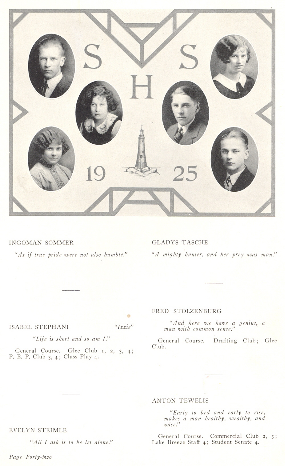 1925 Sheboygan High School, Page 42: Ingoman Sommer, Isabel Stephani, Evelyn Steimle, Gladys Tasche, Fred Stolzenburg, Anton Tewelis.