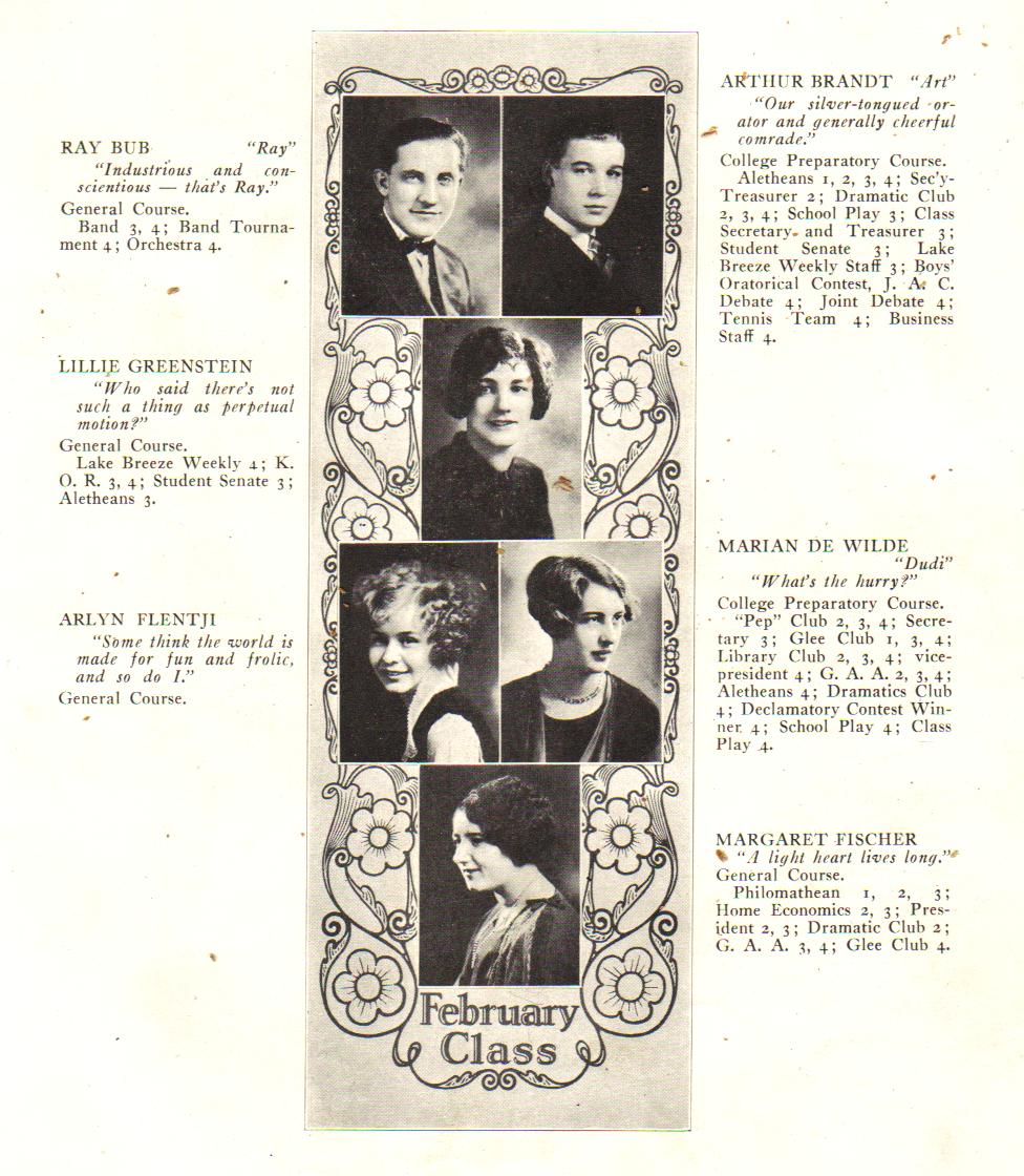 1926 Sheboygan High School, Page 25: Ray Bub, Arthur Brandt, Lillie Greenstein, Arlyn Flentji, Marian De Wilde, Margaret Fischer.