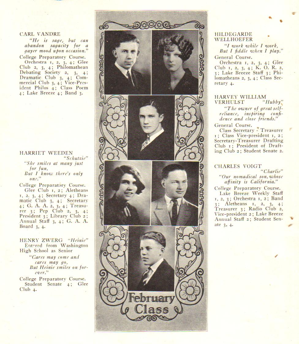 1926 Sheboygan High School, Page 32: Carl Vandre, Hildegarde Wellhoefer, Harvey Verhulst, Harriet Weeden, Charles Voigt, Henry Zwerg.