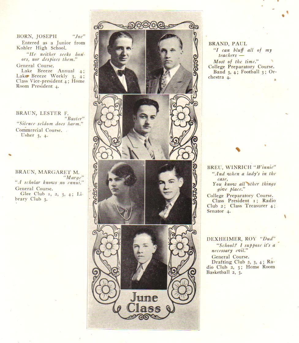 1926 Sheboygan High School, Page 39: Joseph Born, Paul Brand, Lester Braun, Margaret Braun, Winrich Breu, Roy Dexheimer.