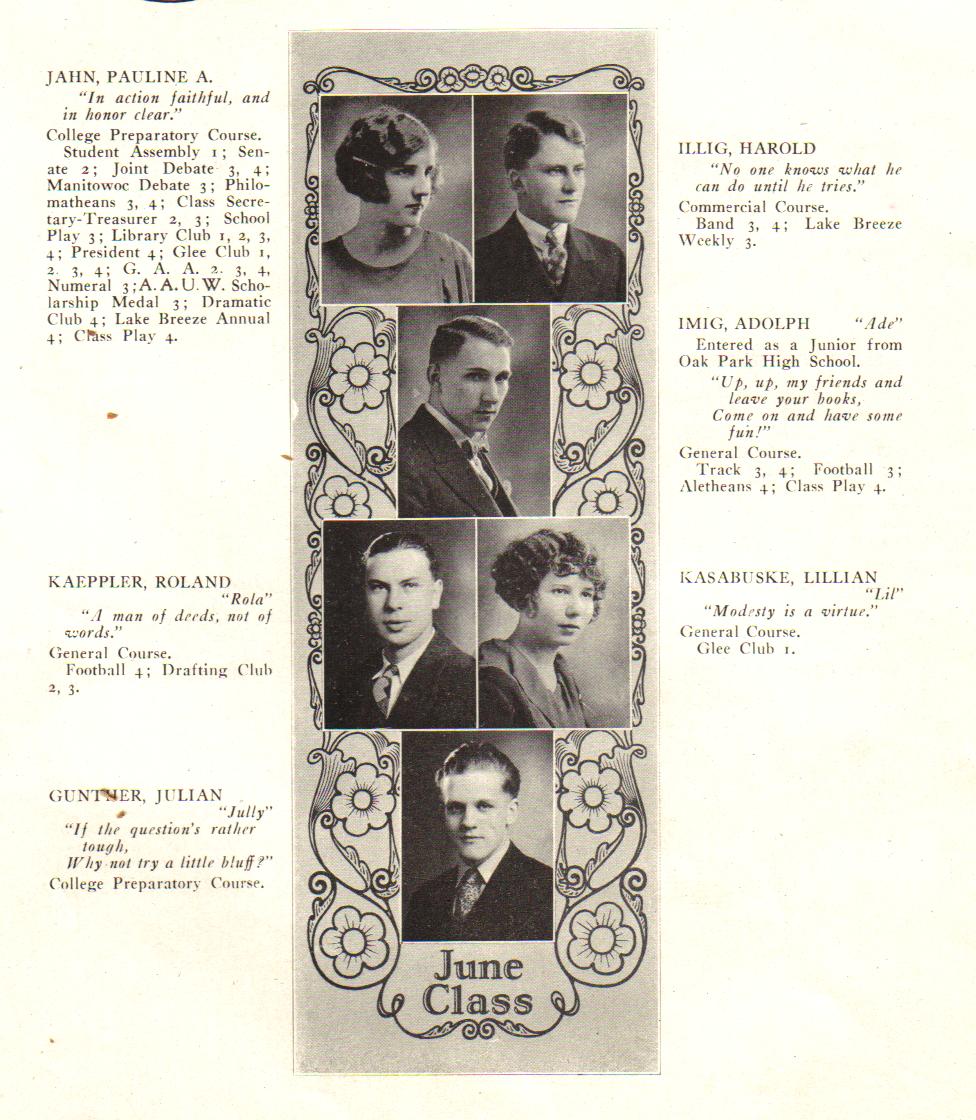 1926 Sheboygan High School, Page 44: Pauline Jahn, Harold Illig, Adolph Imig, Roland Kaeppler, Lillian Kasabuske, Julian Gunther.