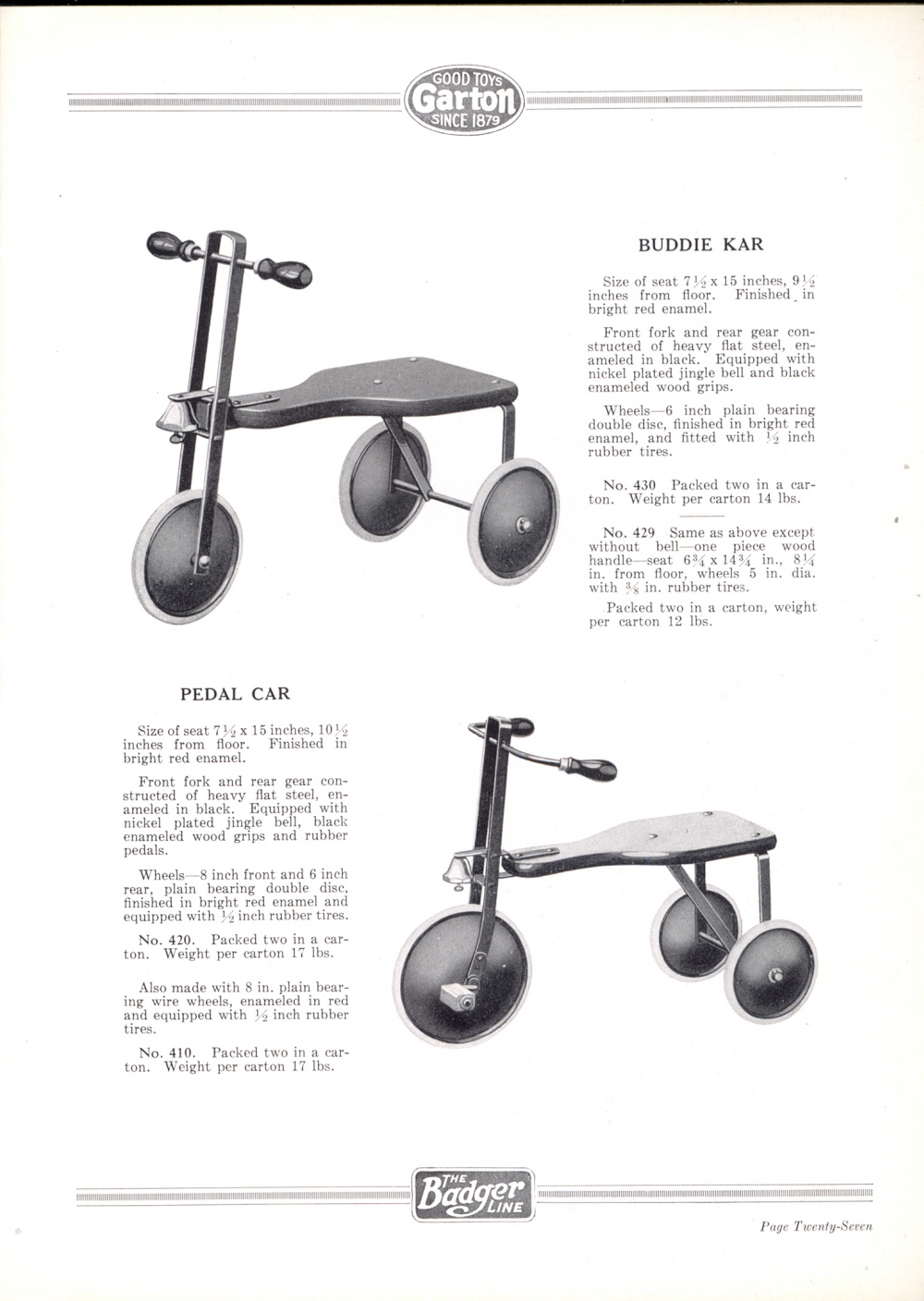 1927 Garton Toy Company Catalogue, Page 27: Buddie Kar and Pedal Car.