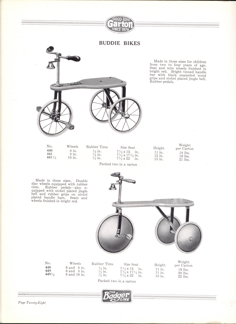 1927 Garton Toy Company Catalogue, Page 28: Buddie Bikes.