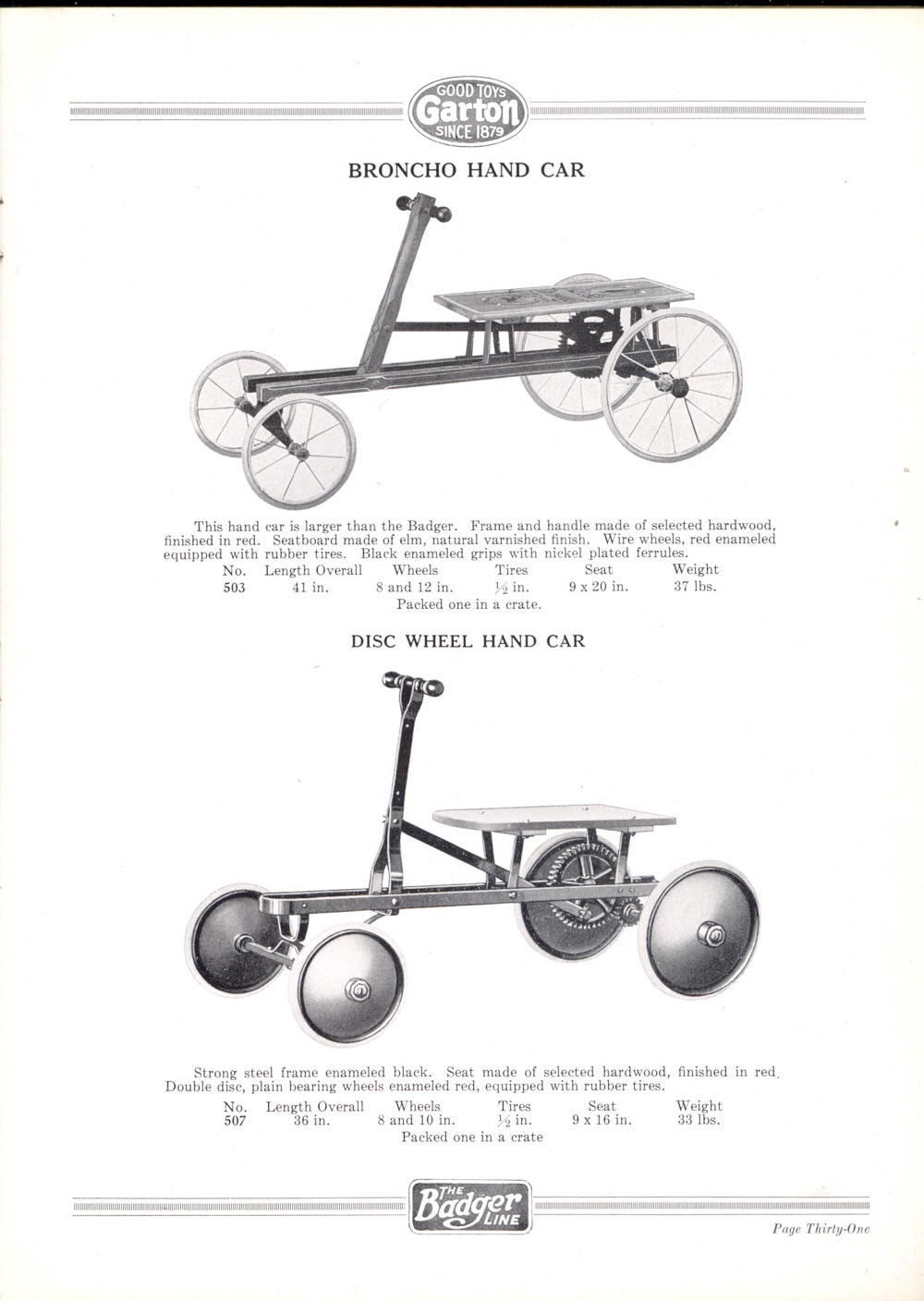1927 Garton Toy Company Catalogue, Page 31: Broncho Hand Car, Disc Wheel Hand Car.
