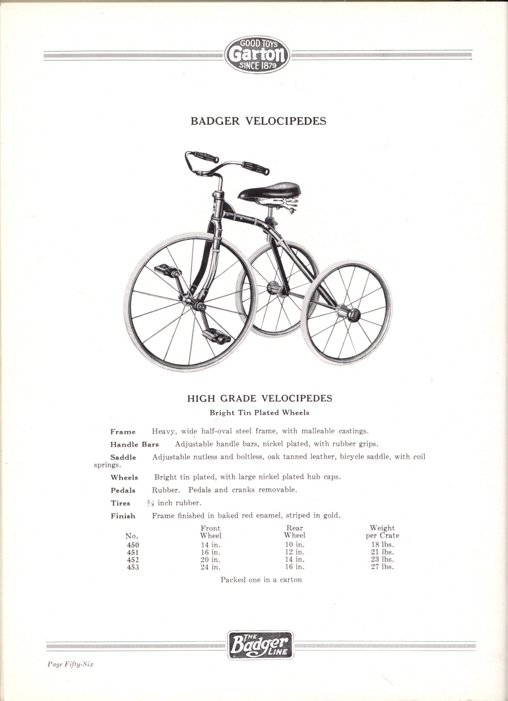 1927 Garton Toy Company Catalogue, Page 56: Badger Velocipedes -- High Grade Velocipedes.