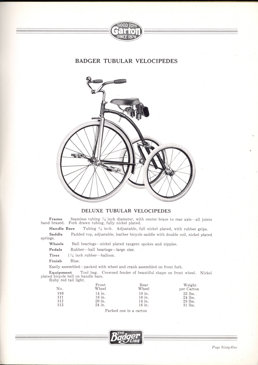 1927 Garton Toy Company Catalogue, Page 61: Badger Tubular Velocipedes -- Deluxe Tubular Velocipedes"> .