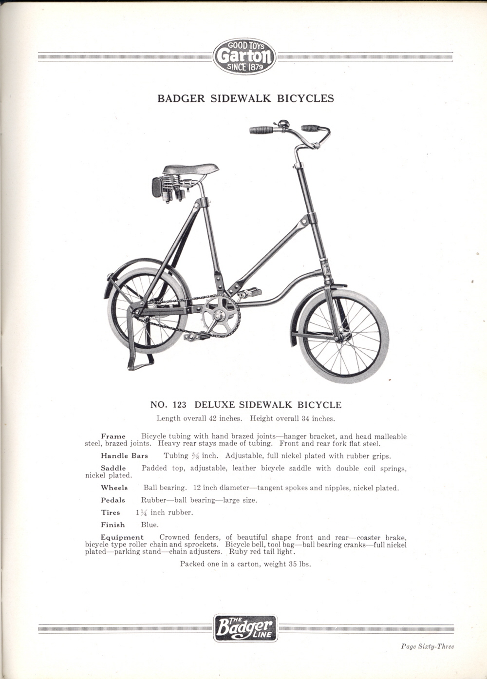 1927 Garton Toy Company Catalogue, Page 63: Badger Sidewalk Bicycles -- Deluxe Sidewalk Bicycle"> .