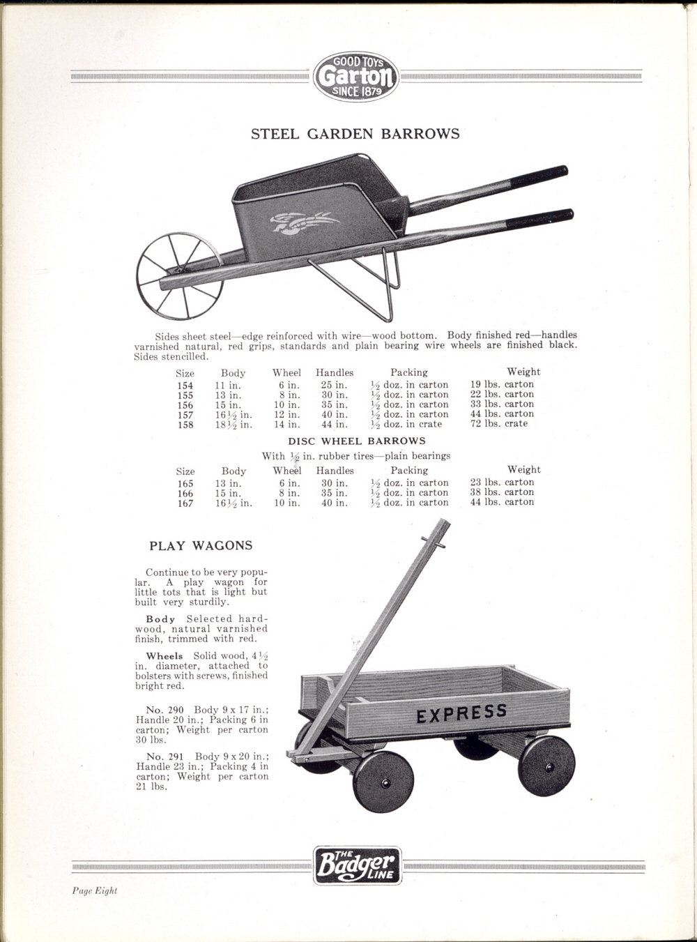 1927 Garton Toy Company Catalogue, Page 8: Wheel Barrows and Play Wagons.