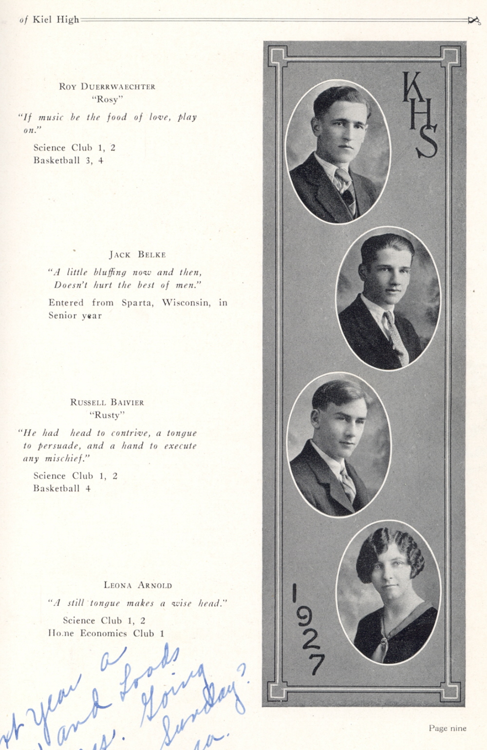 1927 Kiel High School, Page 9: Roy Duerrwaechter, Jack Belke, Russell Baivier, Leona Arnold.