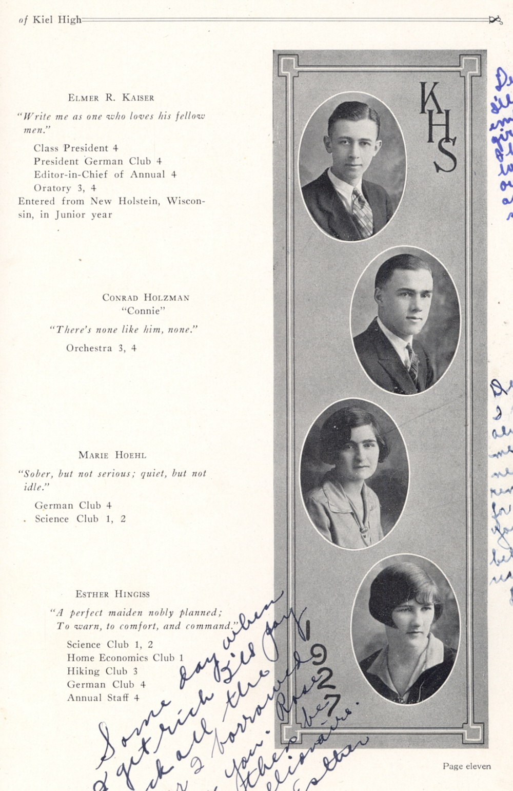 1927 Kiel High School, Page 11: Elmer R. Kaiser, Conrad Holzman, Marie Hoehl, Esther Hingiss.