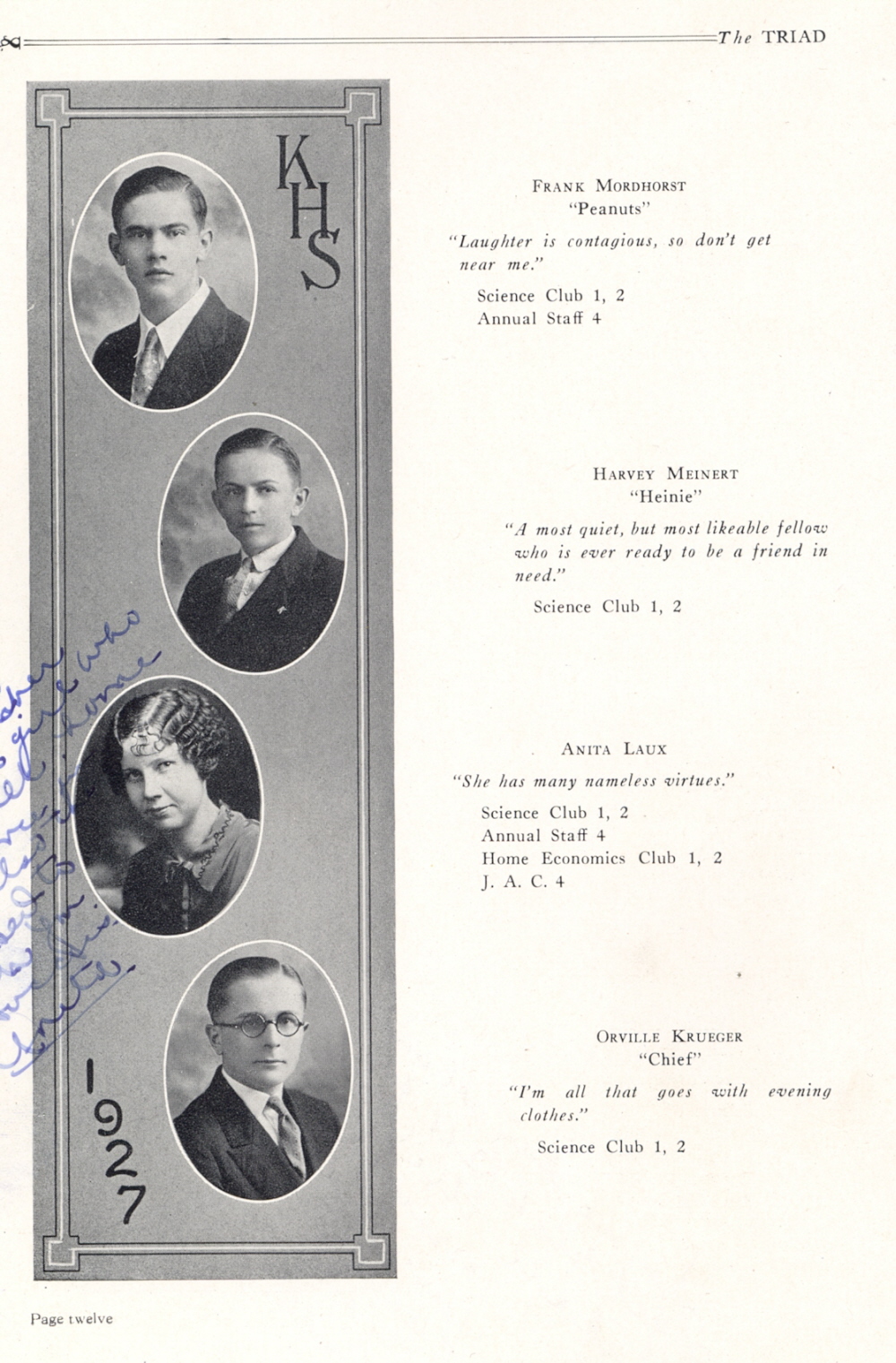 1927 Kiel High School, Page 12: Frank Mordhorst, Harvey Meinert, Anita Laux, Orville Krueger.