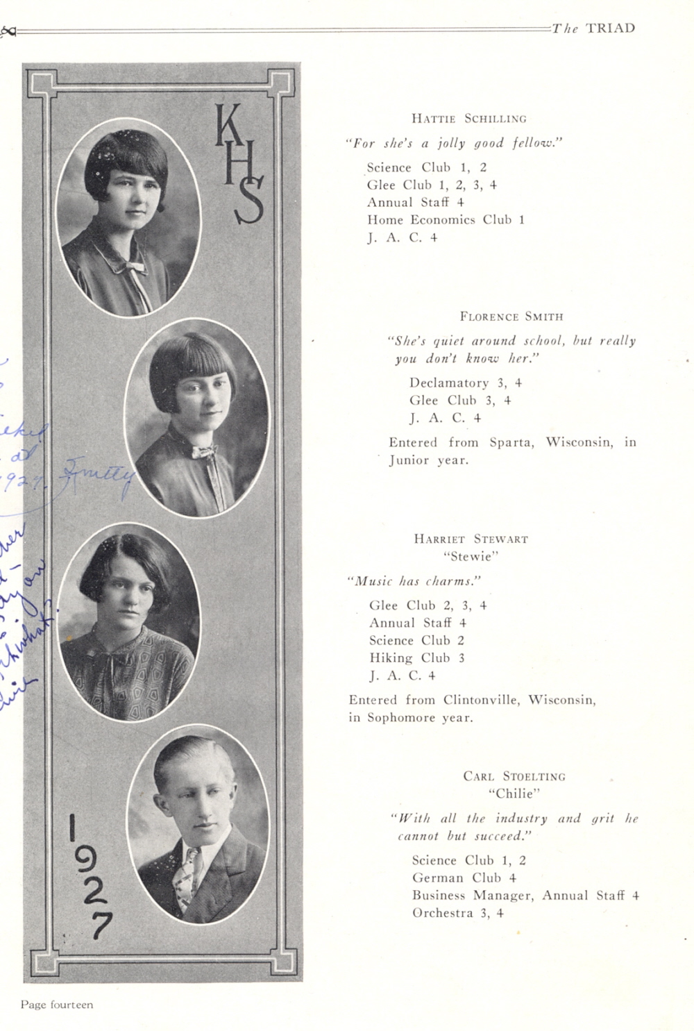 1927 Kiel High School, Page 14: Hattie Schilling, Florence Smith, Harriet Stewart, Carl Stoelting.