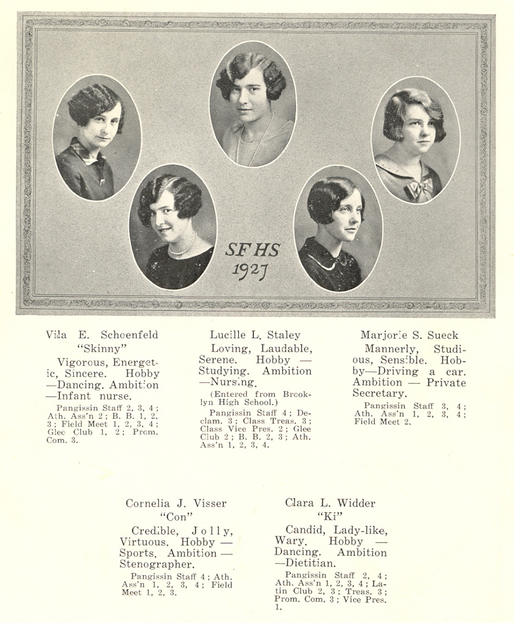 1927 Sheboygan Falls High School, Page 16: Vila Schoenfeld, Lucille Staley, Marjorie Sueck, Cornelia Visser, Clara Widder.