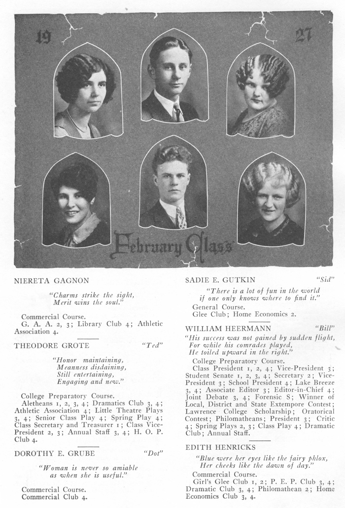 1927 Sheboygan High School, Page 30: Niereta Gagnon, Sadie Gutkin, Theodore Grote, William Heermann, Dorothy Grube, Edith Henricks.