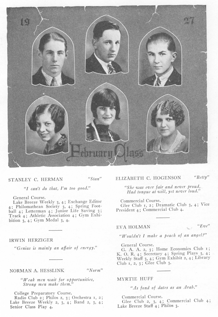 1927 Sheboygan High School, Page 31: Stanley Herman, Elizabeth Hogenson, Irwin Herziger, Eva Holman, Norman Hesslink, Myrtie Huff.