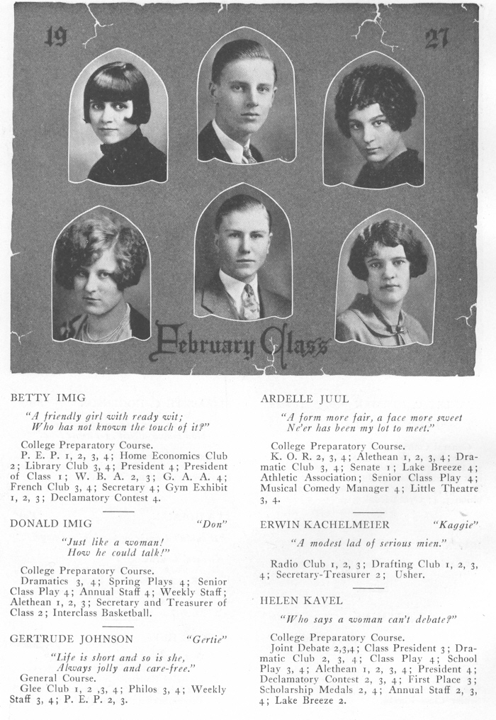 1927 Sheboygan High School, Page 32: Betty Imig, Ardelle Juul, Donald Imig, Erwin Kachelmeier, Gertrude Johnson, Helen Kavel.