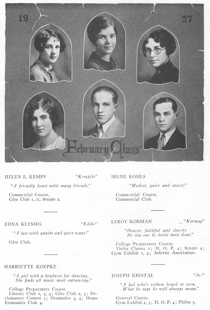 1927 Sheboygan High School, Page 33: Helen Kempf, Irene Kohls, Edna Klessig, Leroy Korman, Harriette Koepke, Joseph Kristal.