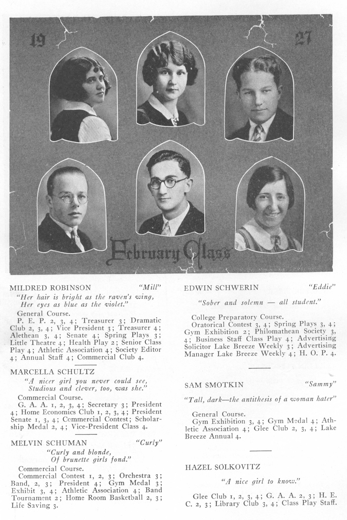 1927 Sheboygan High School, Page 38: Mildred Robinson, Edwin Schwerin, Marcella Schultz, Sam Smotkin, Melvin Schuman, Hazel Solkovitz.