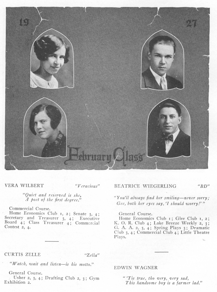 1927 Sheboygan High School, Page 40: Vera Wilbert, Beatrice Wiegerling, Curtis Zelle, Edwin Wagner.