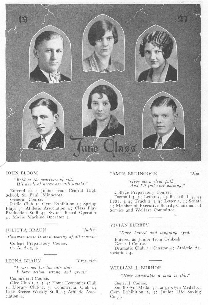1927 Sheboygan High School, Page 51: John Bloom, James Bruinooge, Julitta Braun, Vivian Burbey, Leona Braun, William Burhop.