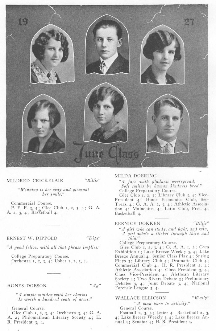 1927 Sheboygan High School, Page 52: Mildred Crickelair, Milda Doering, Ernest Dippold, Bernice Dokken, Agnes Dobson, Wallace Ellicson.