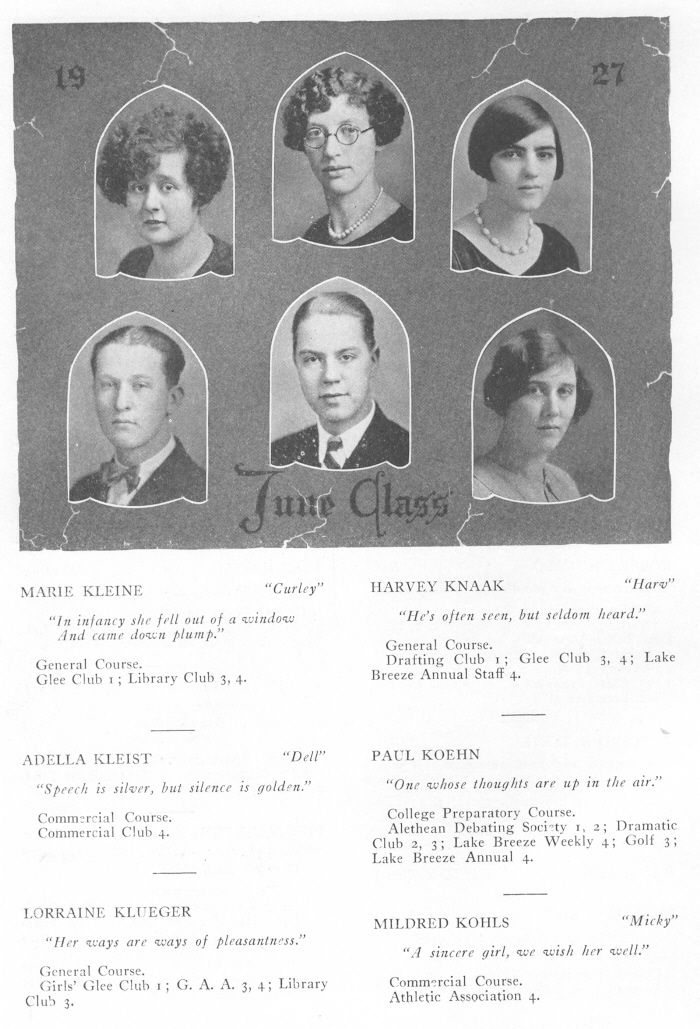 1927 Sheboygan High School, Page 56: Marie Kleine, Harvey Knaak, Adella Kleist, Paul Koehn, Lorraine Klueger, Mildred Kohls.
