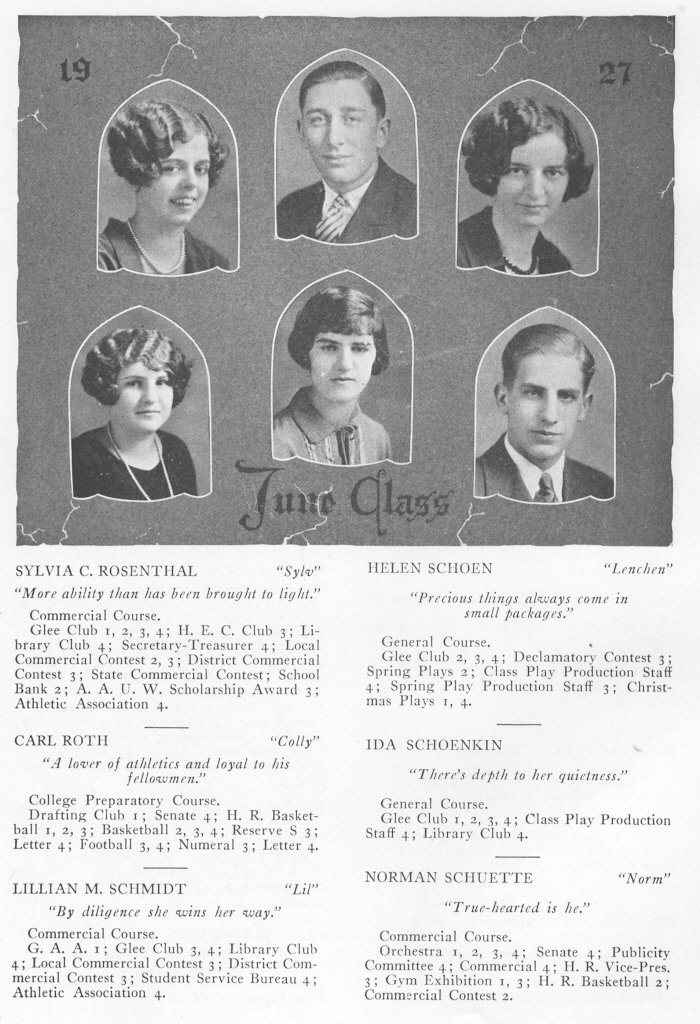 1927 Sheboygan High School, Page 62: Sylvia Rosenthal, Helen Schoen, Carol Roth, Ida Schoenkin, Lillian Schmidt, Norman Schuette.