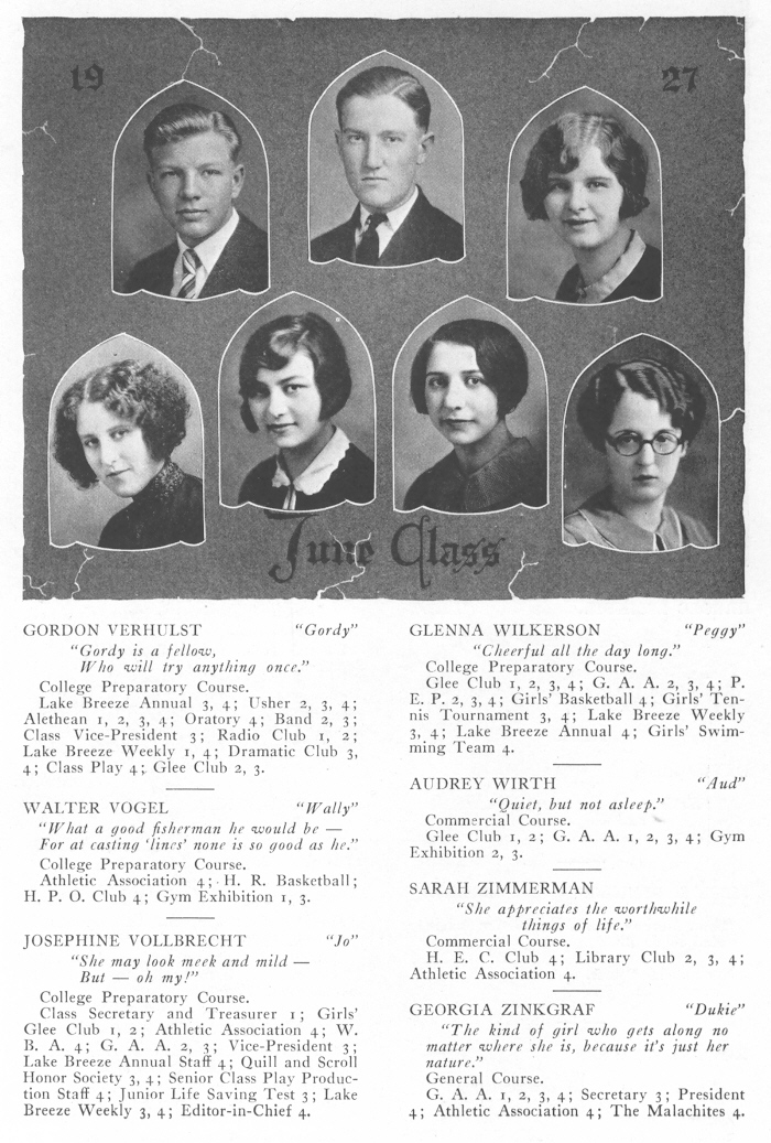 1927 Sheboygan High School, Page 65: Gordon Verhulst, Glenna Wilkerson, Walter Vogel, Audrey Wirth, Josephine Vollbrecht, Sarah Zimmerman, Georgia Zinkgraf.