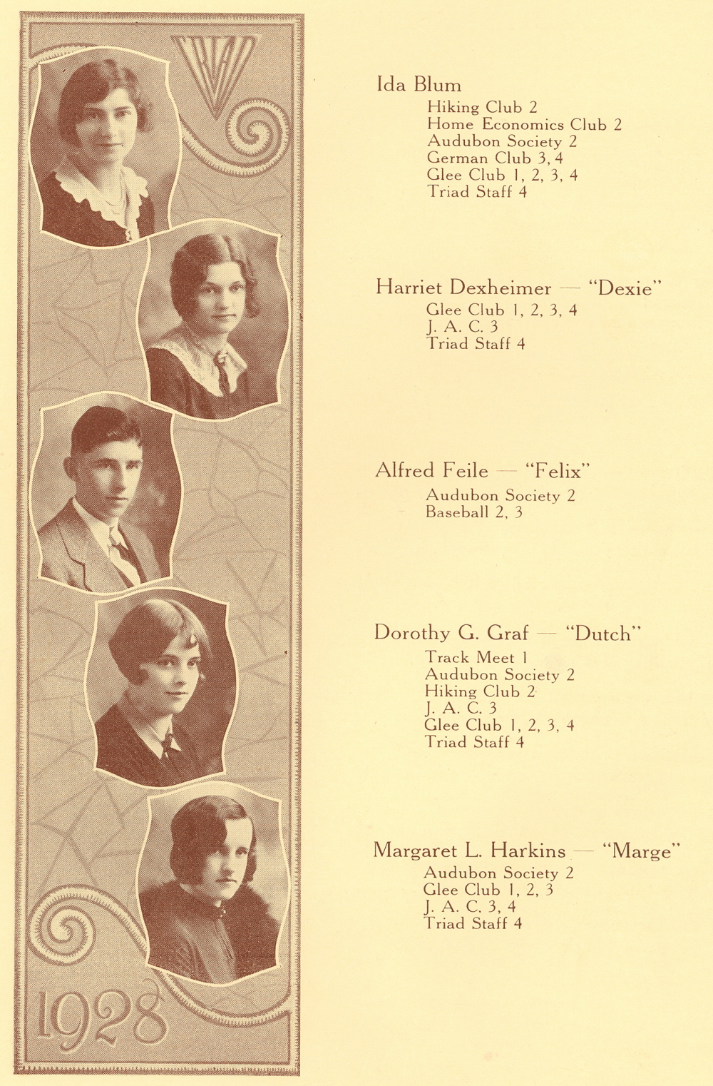 1928 Kiel High School, Page 12: Ida Blum, Harriet Dexheimer, Alfred Feile, Dorothy Graf, Margaret Harkins.