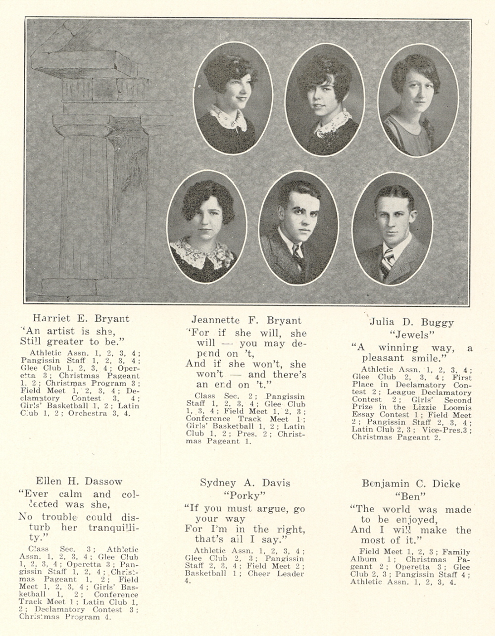 1928 Sheboygan Falls High School, Page 14: Harriet Bryant, Jeannette Bryant, Julia Buggy, Ellen Dassow, Sydney Davis, Benjamin Dicke.